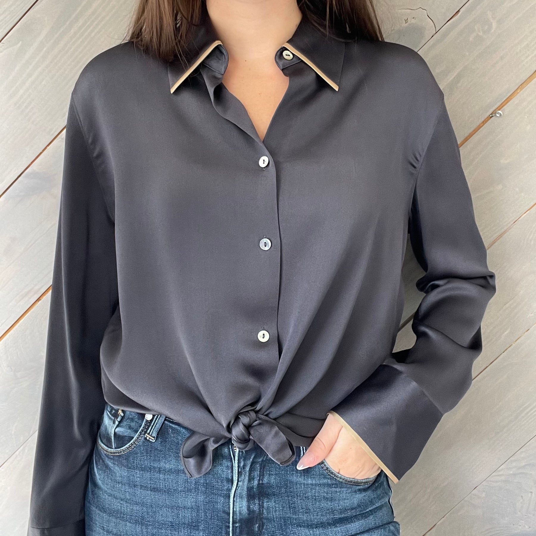 Vince MEDIUM Navy Slate Silk Button Down Blouse (New With Tags)